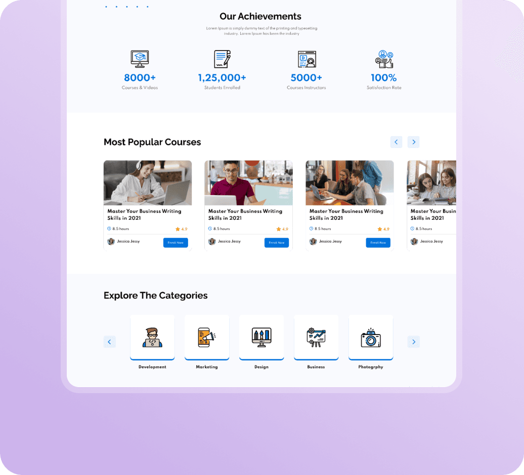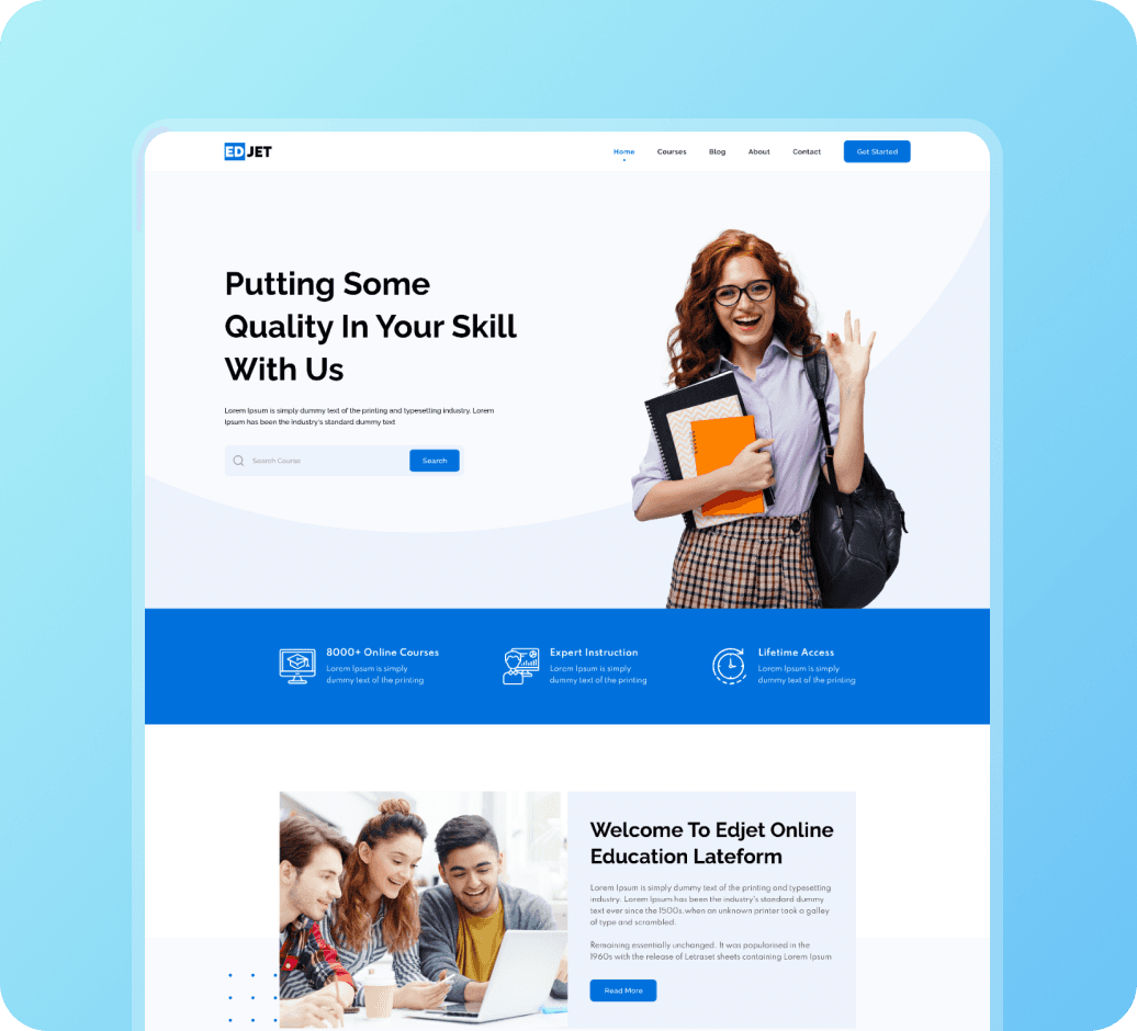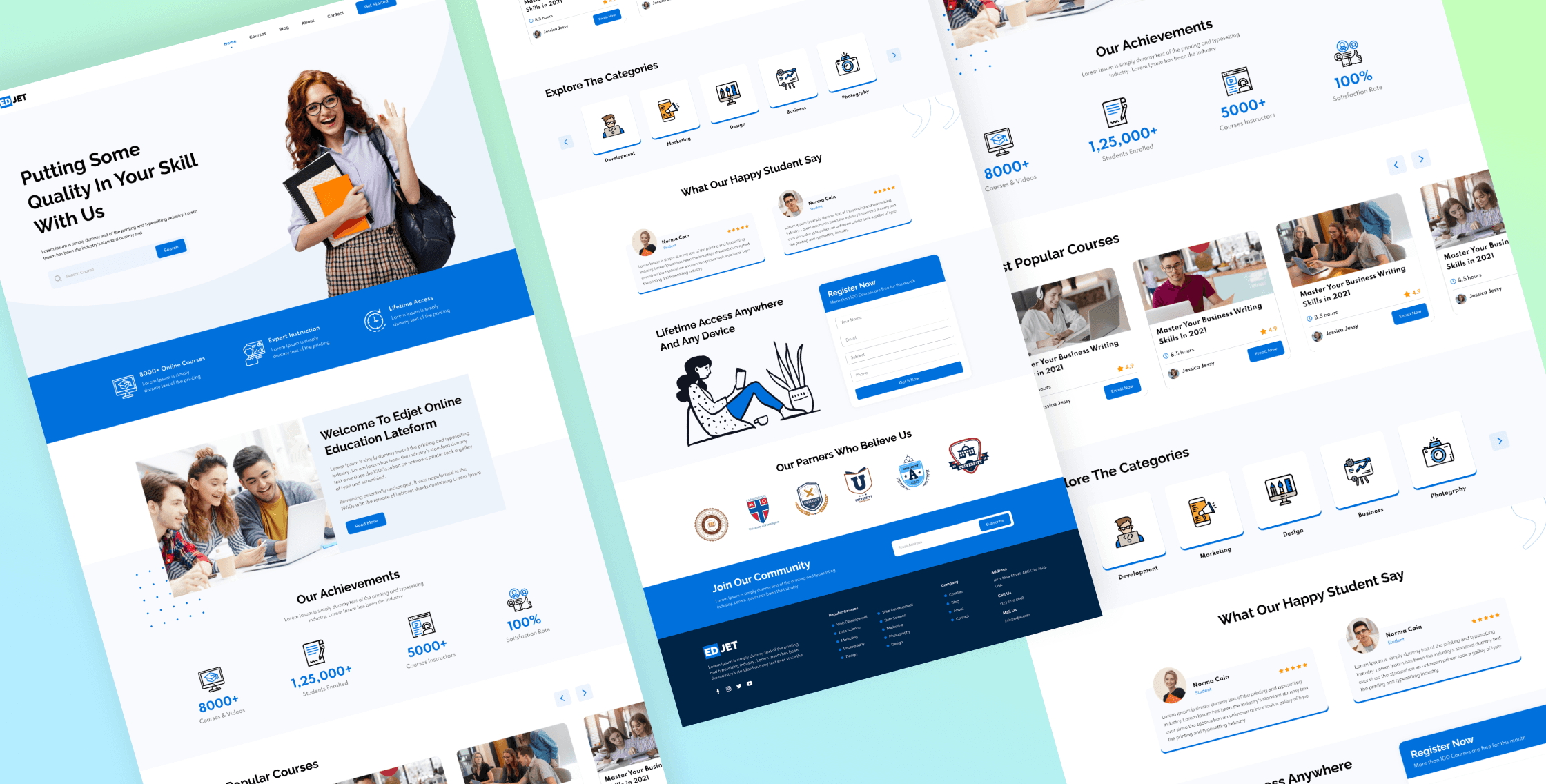 The platform features structured course categories, personalized recommendations, progress tracking, and interactive elements like quizzes and discussion forums. With a clean, modern interface and responsive design, Edjet aims to make learning accessible, enjoyable, and effective for a wide audience.